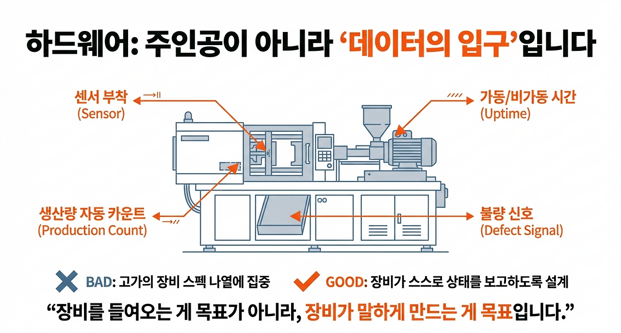 - 생산량, 가동시간, 불량 신호 같은 최소 데이터가 자동으로 잡히도록 설계해야 한다