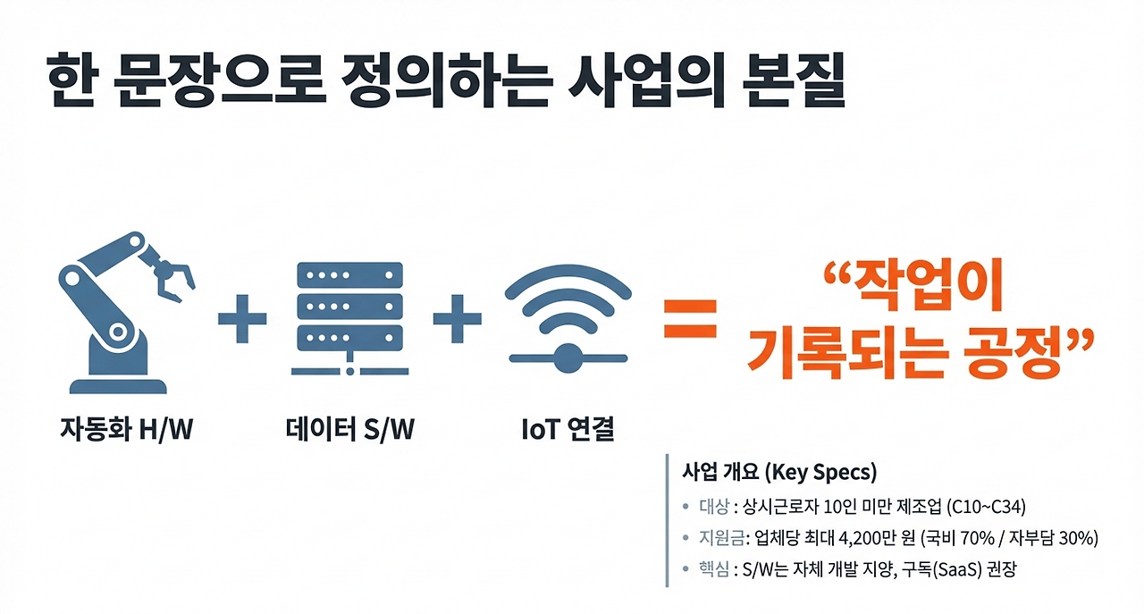 자동화 하드웨어(HW)와 함께, 데이터 수집·연계 소프트웨어(SW) 및 사물인터넷(IoT, Internet of Things) 연결을 묶어 “작업이 기록되는 공정”으로 전환시키는 사업이다.