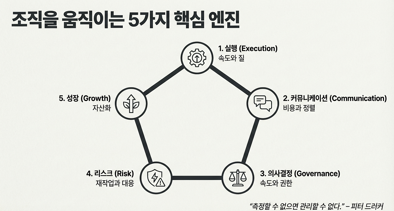 실행, 커뮤니케이션, 의사결정, 리스크, 성장의 다섯 영역으로 나누었다.