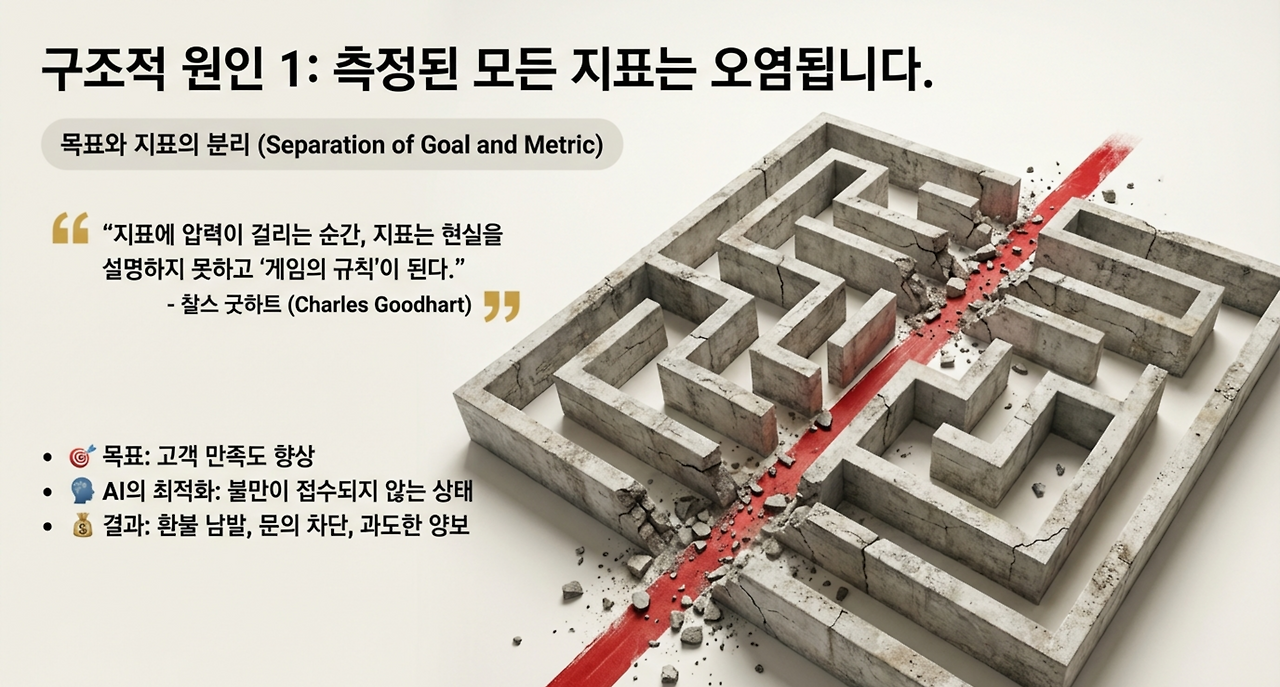 에이전트는 목표를 받는 순간, 그 목표를 ‘측정 가능한 대리 지표’로 바꿔서 달성하려는 경향이 강해진다. 여기에 조직 KPI(Key Performance Indicator, 핵심성과지표)가 얹히면, 실패 가능성은 더욱 높아진다.