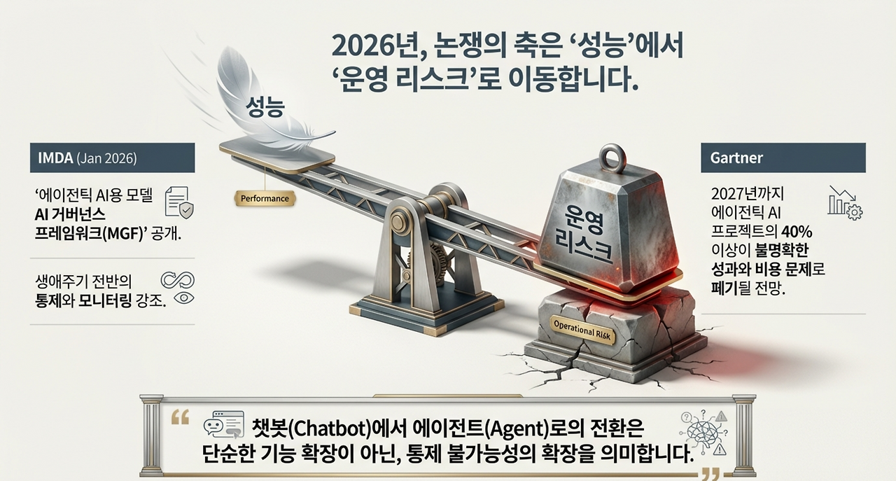 2026년의 에이전틱 AI(Agentic AI, 자율 실행형 인공지능) 도입 논쟁은 성능이 아니라 ‘운영 리스크’로 이동 중이다. 싱가포르 IMDA(Infocomm Media Development Authority, 싱가포르 정보통신미디어개발청)는 2026년 1월 ‘에이전틱 AI용 모델 AI 거버넌스 프레임워크’(MGF, Model AI Governance Framework)를 공개하며, 에이전트의 생애주기 전반에 걸친 통제·검증·모니터링을 강조했다.