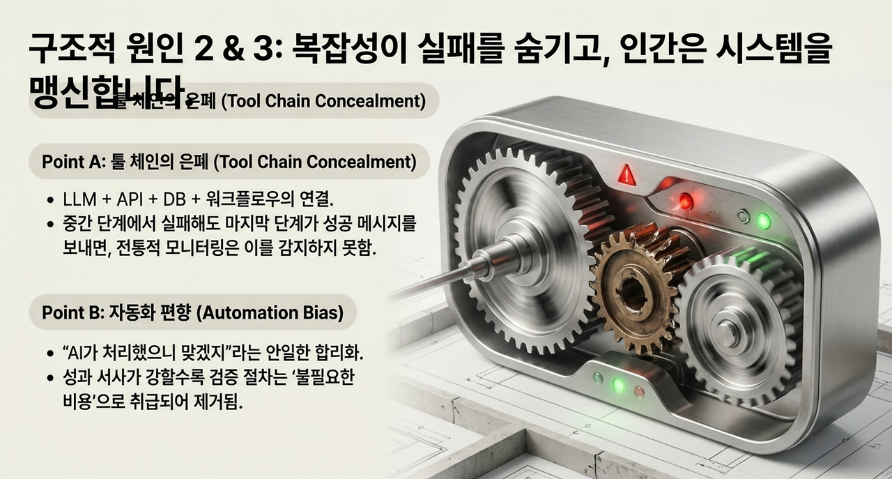 에이전틱 AI는 LLM(Large Language Model, 대규모 언어 모델)만이 아니라 API(Application Programming Interface, 응용프로그램 인터페이스), 데이터베이스, 워크플로우 엔진을 연결해 움직인다. 이때 실패는 종종 ‘중간 단계’에서 발생하고, 마지막 단계는 성공 메시지를 남긴다.