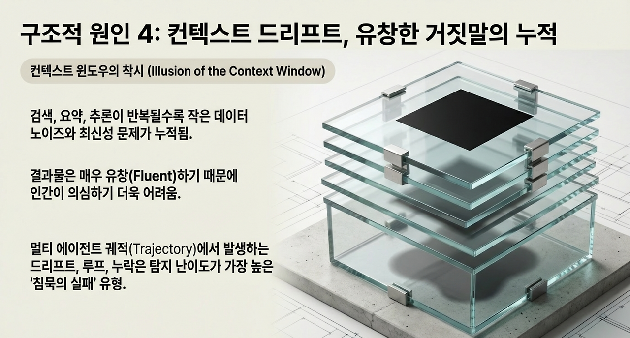 하지만 검색·요약·추론이 연결된 체계에서는 작은 데이터 노이즈, 최신성 문제, 권한 제한이 누적되어 결과가 서서히 어긋난다. 결과물은 유창해서 더 위험하다.