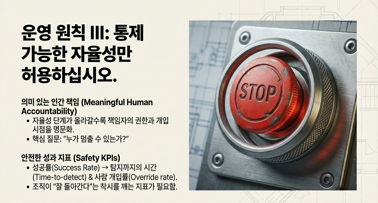 권한이 커질수록 책임은 더 구체화되어야 한다. ‘누가 멈출 수 있는가’가 문서에 있어야 한다.