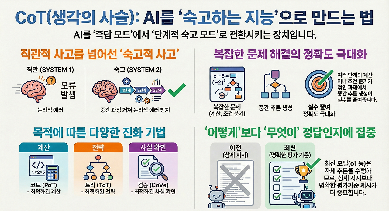 즉, AI를 ‘즉답 모드’에서 ‘단계적 숙고 모드’로 전환시키는 장치가 CoT라는 뜻이다.