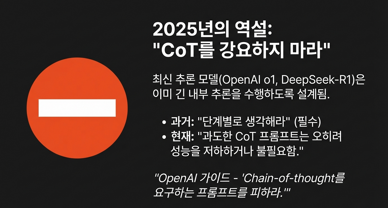 OpenAI의 가이드는 추론 모델에 대해 ‘chain-of-thought를 요구하는 프롬프트를 피하라’고 명시한다.