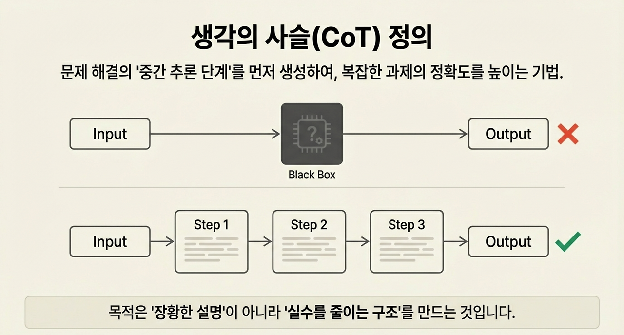 CoT의 목적은 ‘장황한 설명’이 아니라 ‘실수 줄이는 구조’이다.