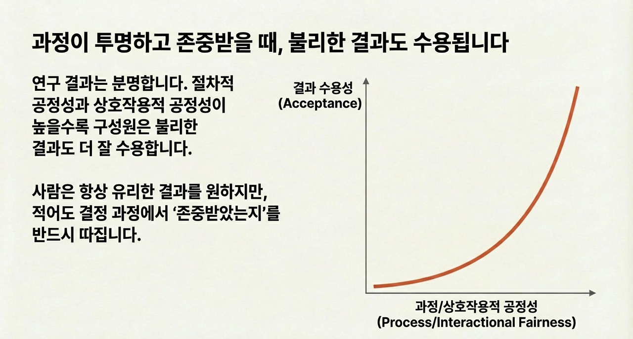 절차적 공정성과 상호작용적 공정성이 높을수록 구성원은 불리한 결과도 더 잘 수용한다.