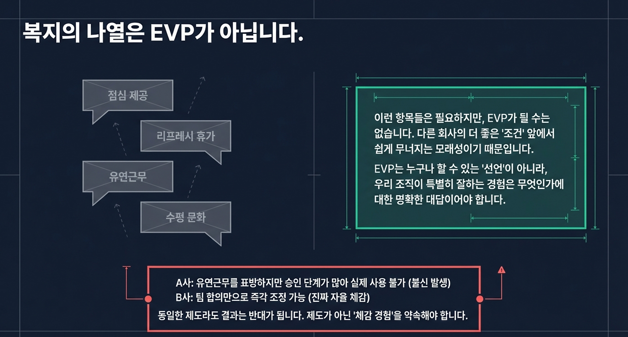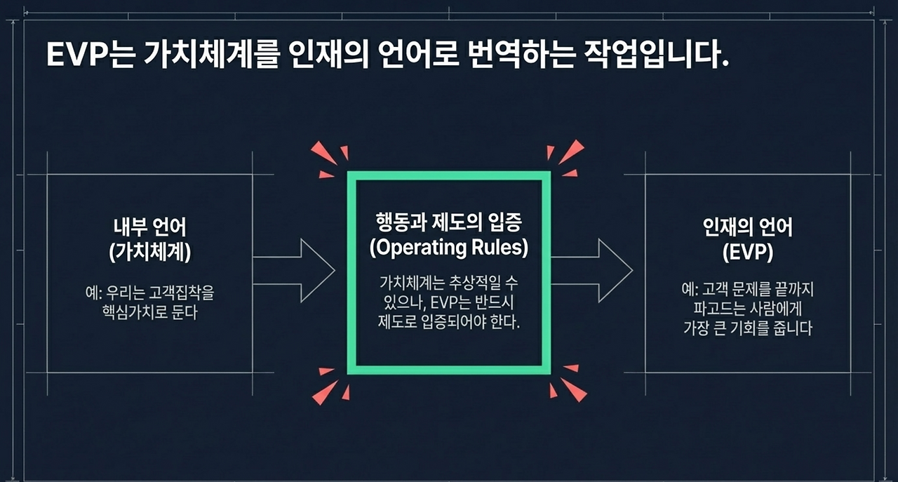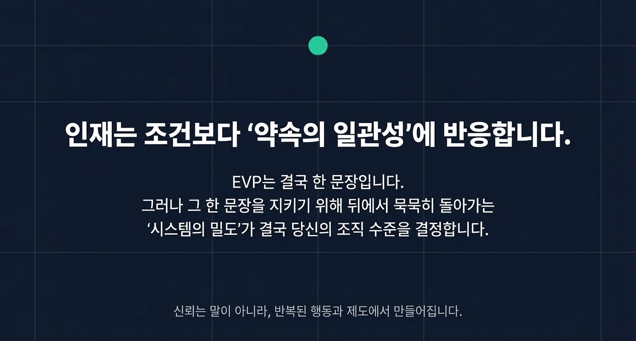 가치체계가 공중에 떠 있으면 EVP는 마케팅 문장이 된다. 반대로 가치체계가 제도로 내려와 있으면 EVP는 사람을 끌어당기는 약속이 된다.