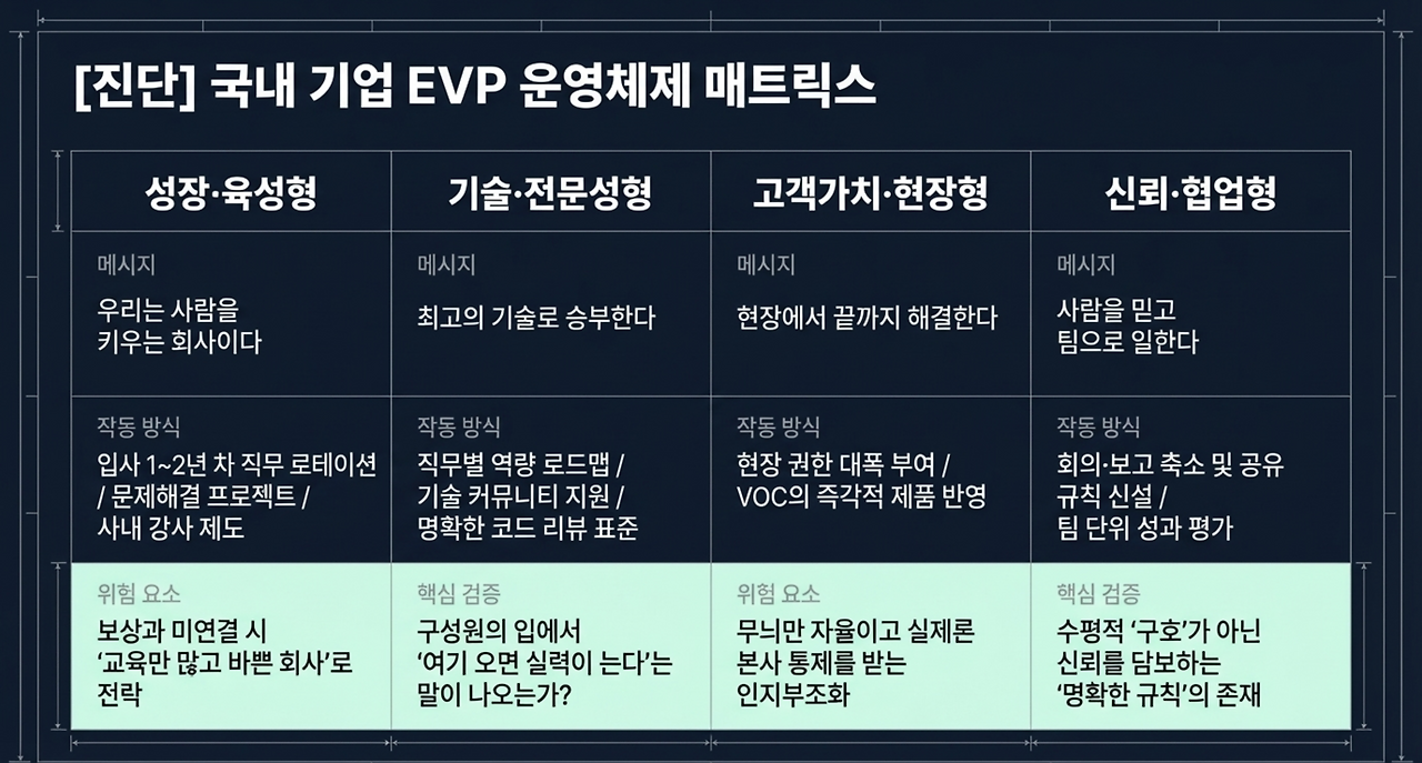 국내 IT·플랫폼·게임 기업에서 자주 나타난다. 이때 EVP는 “복지”보다 “전문성의 밀도”로 증명된다. 구성원이 “여기 오면 실력이 는다”라고 말하기 시작하면 강해진다.