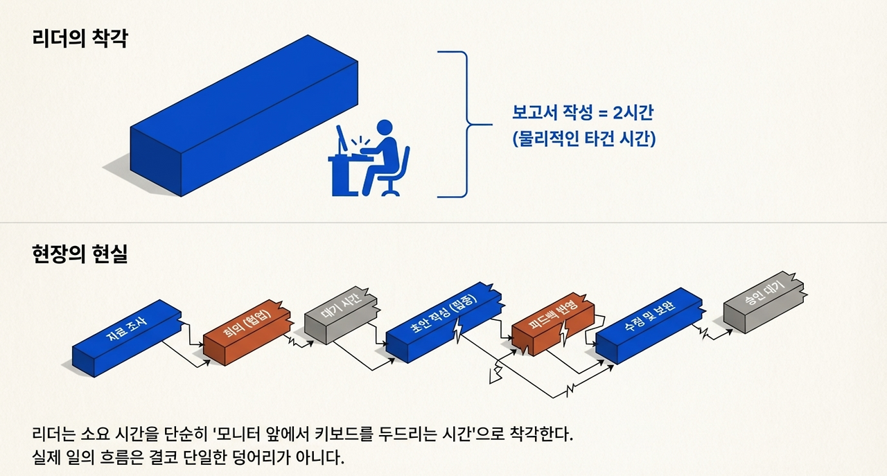 많은 팀장들이 소요 시간을 단순히 실무자가 모니터 앞에서 키보드를 두드리는 물리적인 작업 시간으로만 착각한다.