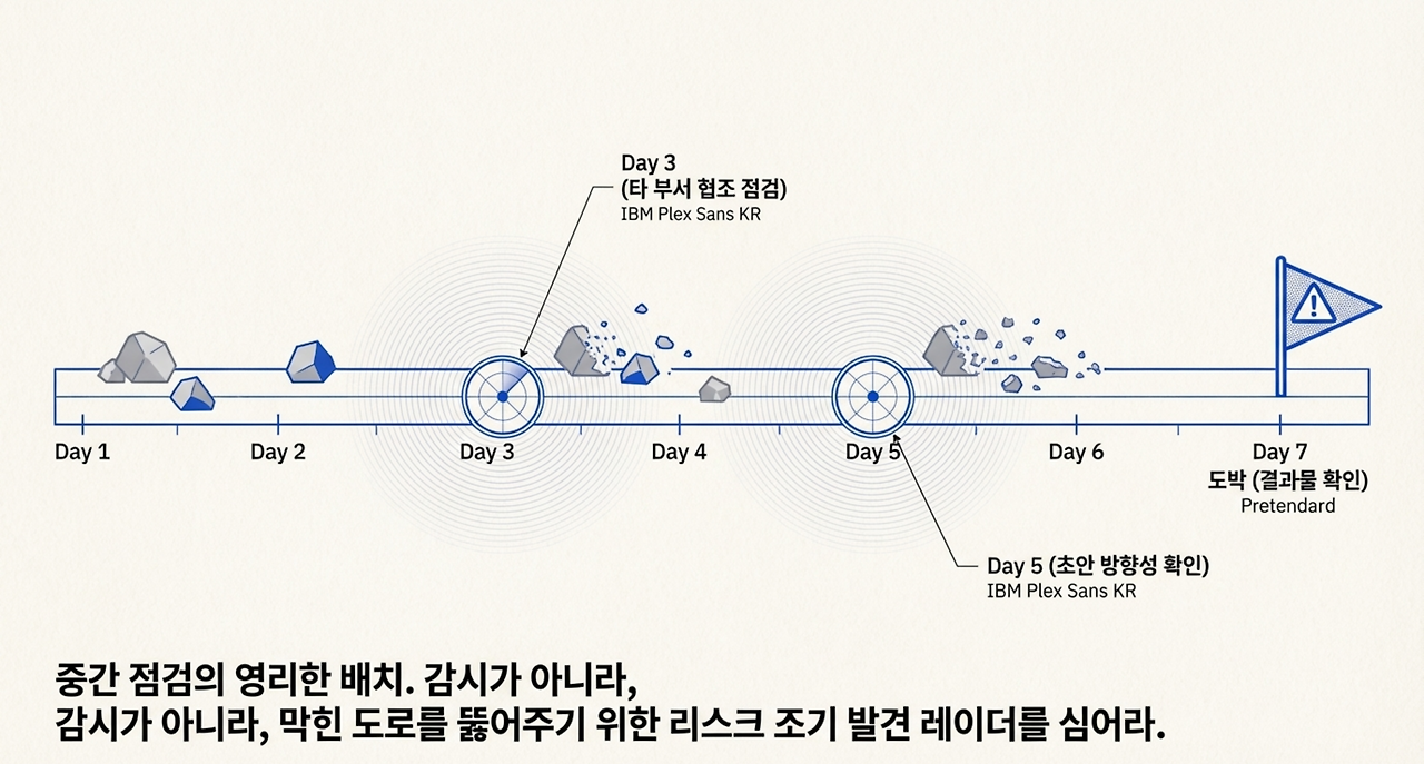 3일 차에 타 부서와의 협조는 잘 진행되고 있는지, 5일 차에 초안의 방향성은 맞는지 확인하는 접점을 미리 심어두어야 한다.