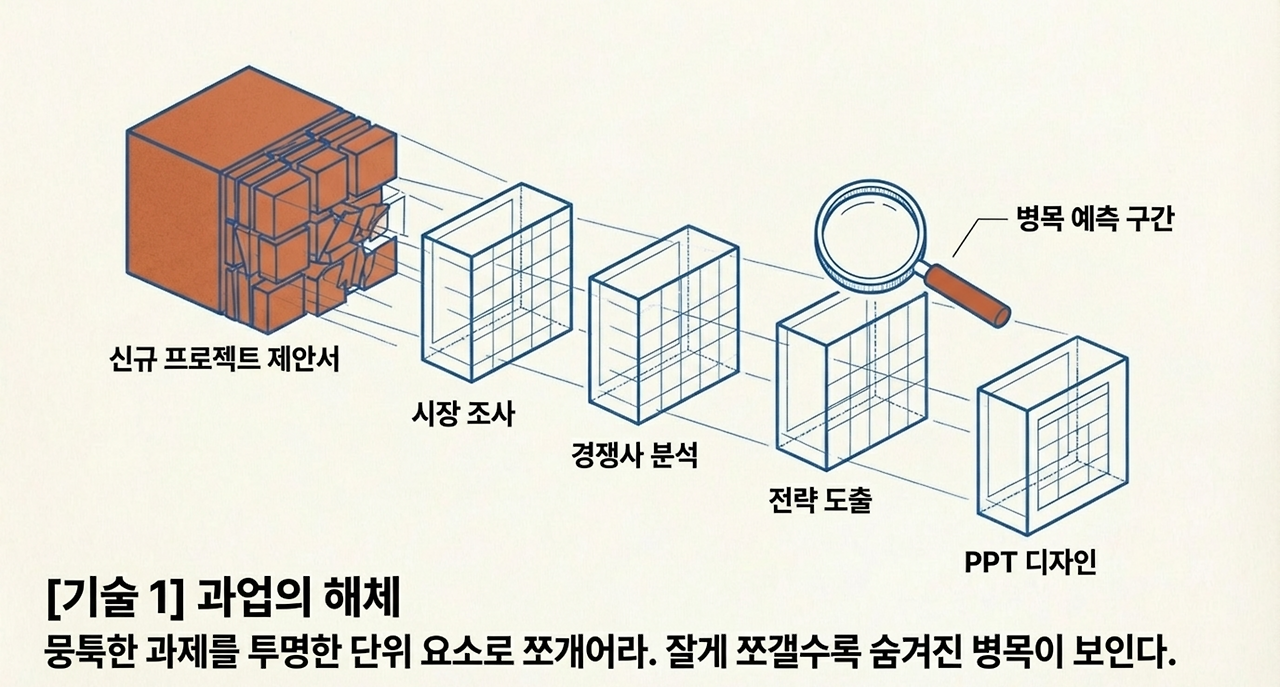 신규 프로젝트 제안서 작성이라는 뭉툭한 과제를 시장 조사, 경쟁사 분석, 전략 도출, 피피티 디자인 등의 단위 요소로 잘게 쪼개야 한다.