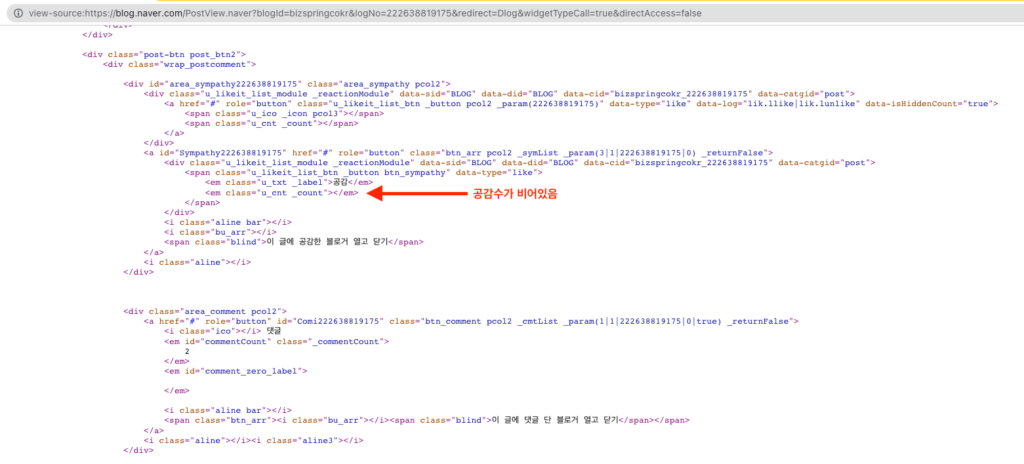 블로그 화면이 로딩된 후 크롬의 개발자도구를 이용하여 확인 해 보면 area_sympathy class를 가진 <div> 내 <em> 엘리먼트가 공감수 값을, area_comment class를 가진 <div> 내 <em> 엘리먼트가 댓글수 값을 가지고 있는 것이 확인됩니다. 하지만, 아래 이미지와 같이 웹페이지를 호출하여 응답으로 출력된 HTML을 보면 공감수가 비어 있습니다. 웹페이지가 웹브라우저에 로딩 된 후 ajax 스크립트 등 추가적인 작업에 의해 공감수 값이 채워지게 되는 것입니다. 따라서 웹페이지 소스 HTML을 가져와 사용하는 전통적인 크롤러에서는 공감값을 가져올 수 없는 것입니다.