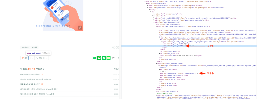 이제 네이버 블로그의 공감수, 댓글수를 가져오는 크롤러를 작성해 보겠습니다.