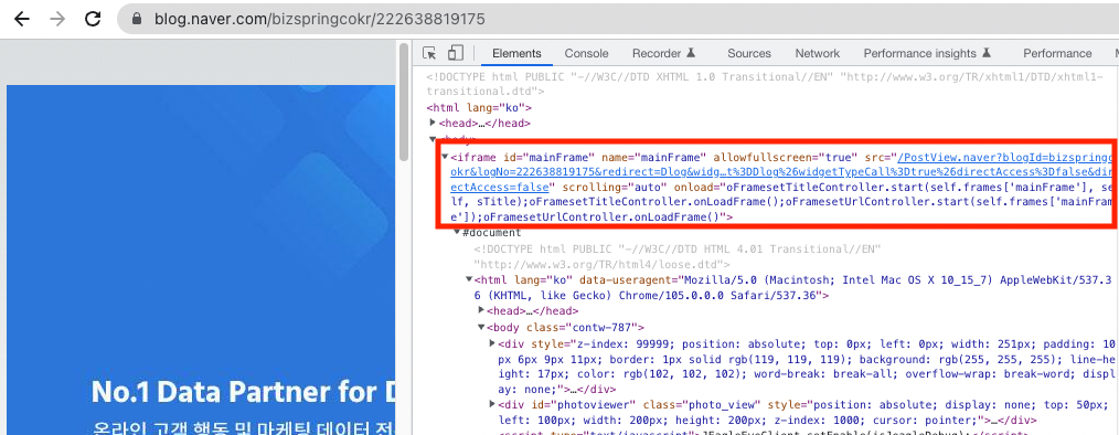 12라인까지 브라우저에서 블로그 페이지를 여는 코드는 동일합니다. 블로그 페이지 소스를 살펴보면 iframe으로 컨텐츠를 불러오도록 되어있는데 이는 두개의 창을 연 것과 같습니다. 이에 따라 selenium이 공감수 객체에 접근할 수 있도록 mainFrame id를 가진 iframe을 지정해 줍니다.
