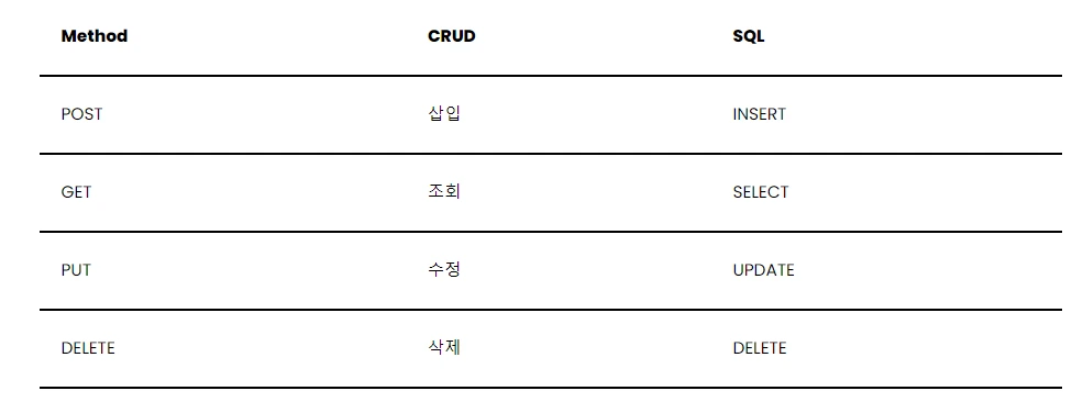 위에 작성된 표와 각각의 POST, GET, PUT DLEETE 메소드는 삽입, 조회, 수정, 삭제가 가능합니다.