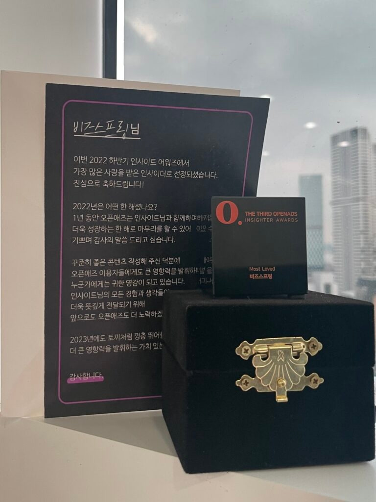 비즈스프링은 매월 블로그, 페이스북, 브런치, 오픈애즈 등 여러 채널을 통해 데이터 활용에 대한 인사이트와 솔루션 활용방법 등 다양한 콘텐츠를 배포하고 있는데요. 비즈스프링이 올 1월 오픈애즈 어워즈에서 22년 하반기 가장 많은 사랑을 받은 기업 인사이터 MOST LOVED의 수상자로 선정되었습니다.