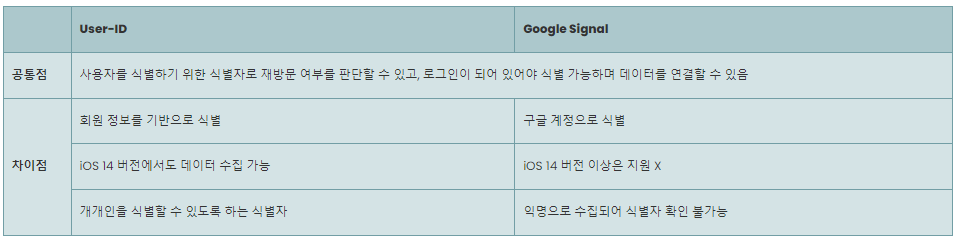 사용자 식별자에는 위와 같은 종류가 있는데 그중 User-ID와 Google Signal에 대해 많이 궁금해하고 헷갈려 하는 부분이 있어 무엇인지 함께 알아보도록 하겠습니다.