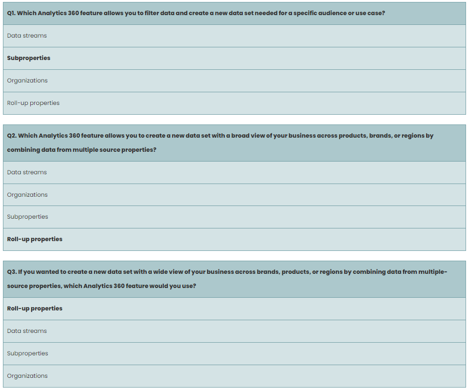 지난 포스팅에 이어 이번에도 Google에서 제공하는 ‘Google Analytics Certification’ 문제들을 기반으로 예시를 알아보도록 하겠습니다. 아래 문제들을 보면 Analytics 360에서 사용되며 데이터를 필터링하고 필요한 새 데이터 세트를 생성할 수 있는 기능으로 하위 속성(Subproperties)이 언급된 것을 확인할 수 있습니다. 또한, 여러 소스 속성의 데이터를 결합하여 비즈니스를 광범위하게 파악할 수 있도록 데이터 세트를 생성하는 롤업 속성(Roll-up properties)이 출제되기도 하였습니다.