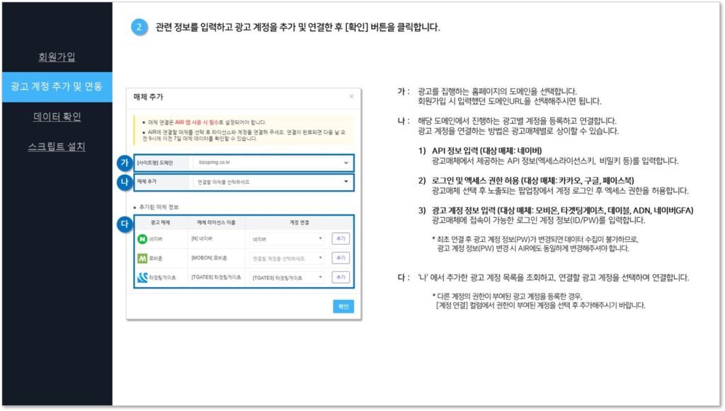 가이드를 통해 편리하게 서비스를 이용할 수 있습니다. 회원가입과 광고 계정 추가 및 데이터 확인 그리고 스크립트 설치하는 방법까지! AIR™ 솔루션 이용을 위한 세팅을 적극 지원합니다. 새로워진 AIR™ 솔루션을 비즈스프링과 함께 시작해 보세요!
