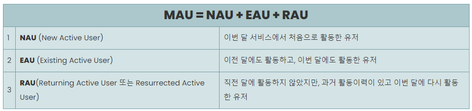 MAU 를 상승하게 만든 프로모션도 있을테고, MAU를 하락하게 만든 외부 이슈나 제품 내 장애요소도 있을 것입니다. 그에 앞서 MAU가 상승하거나 하락했다면 MAU를 구성하는 어떤 속성의 사용자가 상승/하락했는지 살펴봐야합니다. MAU는 아래와 같이 3가지 유형으로 나눌 수 있습니다. 유저는 아래 3가지 유형 중 1개의 유형에만 속하며, 절대 중복되지 않습니다. 즉, NAU + EAU + RAU의 합은 MAU와 같습니다.