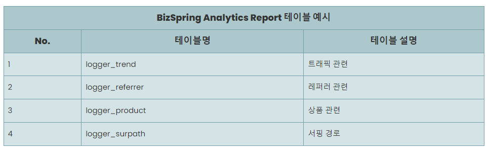 정제된 테이블로 대시보드 및 리포트에서 보여줄 데이터를 의미있게 가공하여 테이블을 생성하고 리포트를 제공합니다. 아래 테이블은 BizSpring Analytics, 로거에서 사용하는 예시 테이블입니다.