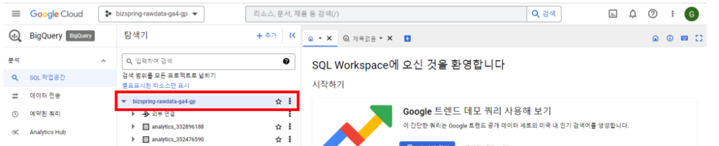 수집된 GA4 데이터와 BigQuery를 연동하는 방법에 대한 설명입니다. 연동 후 BigQuery의 events 테이블에 수집된 데이터를 확인할 수 있습니다.