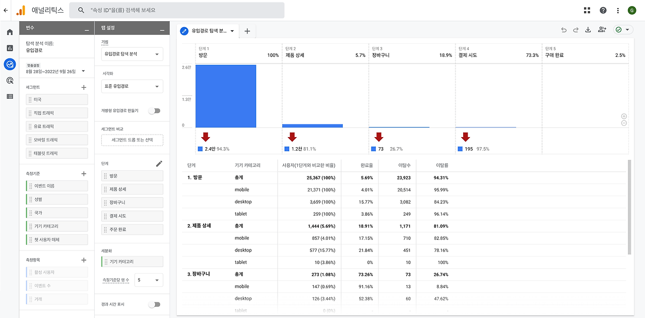 향상된 전자상거래 데이터 수집을 통해 전체 구매 퍼널을 구축합니다. 방문 > 제품 상세 > 장바구니 > 결제 시도 > 주문 완료 각 단계의 이탈을 확인하고 원인을 파악해 온라인 채널의 성과를 개선할 수 있습니다.