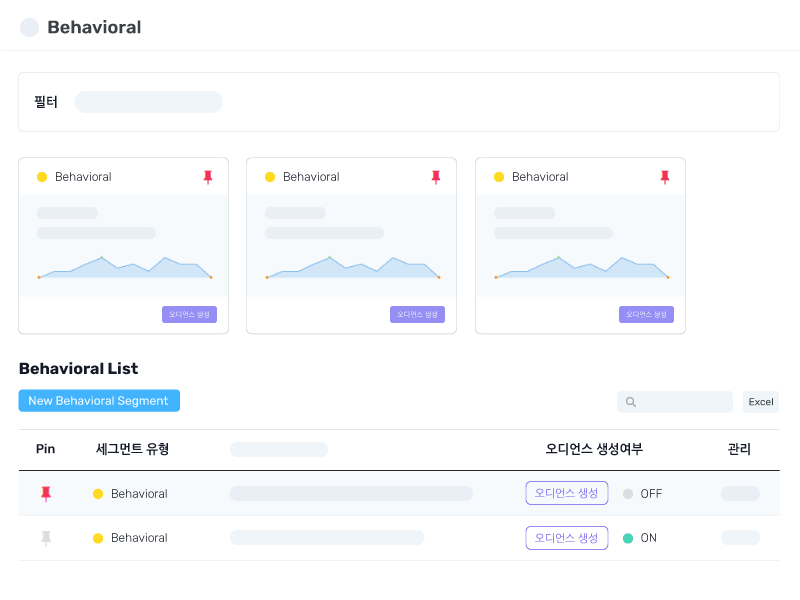 방문자 행동 데이터 또는 AI/ML 기술을 이용하여 목표 잠재고객군을 정의 및 발굴하고, 잠재고객 분석에서 추출까지 개인화 마케팅에 활용할 수 있는 Growth Platform의 서비스입니다.