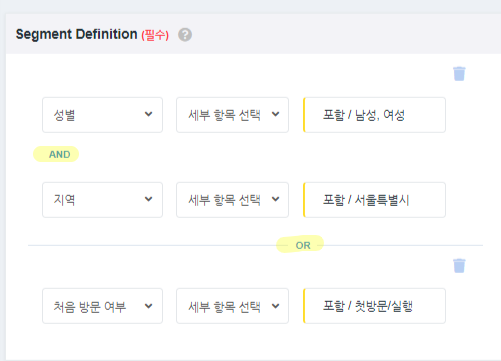 고객의 터치포인트별 행동 특성 및 인구통계학적 요소 등 기존 데이터를 결합하여 사용자가 목적에 맞는 세그먼트를 직접 생성하여 잠재 고객을 추출 할 수 있습니다. 세그먼트 조건 정의 단계에서 한 그룹 안에 여러 개의 조건(AND, OR) 걸어 다른 조건에 대한 잠재고객도 같이 선별이 가능하고, 타깃선정에 효과적 입니다.