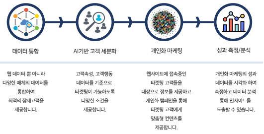 AI 기반 고객 세분화 확장으로 비식별 고객에 이르기까지 고객 속성 및 행동 데이터를 기준으로 정교한 타겟팅 광고 캠페인 기여성과 분석과 디지털 광고매체 데이터 통합 ROAS 리포트를 제공하고, 부정클릭 검출과 대응, 검색광고 입찰/관리 자동화, 타겟 오디언스 추출 및 관리에 관한 시각화된 데이터를 제공하는 플랫폼을 운영하고 있습니다.