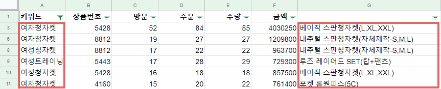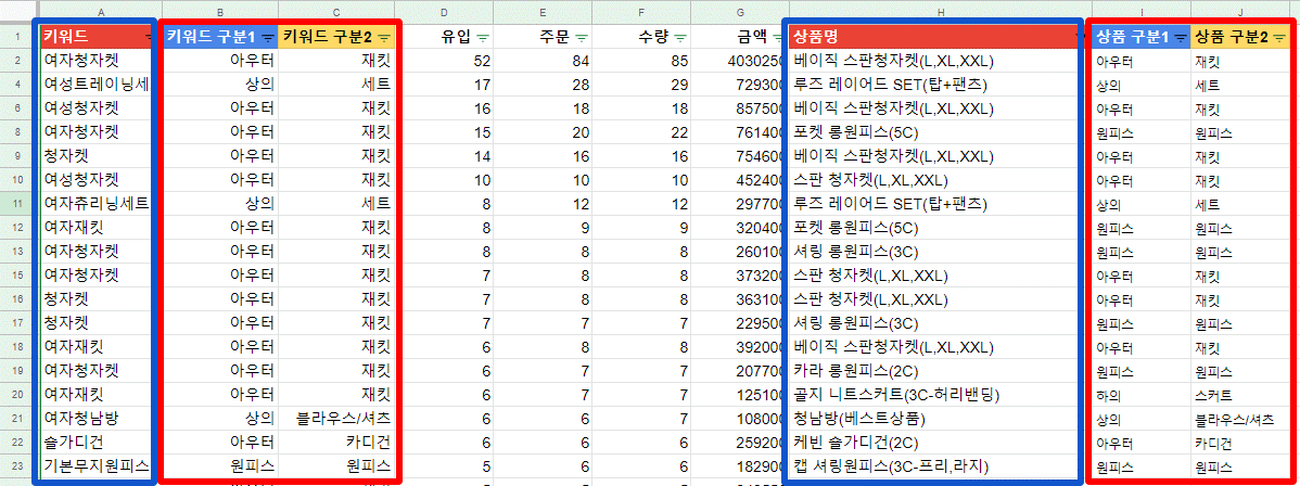 보다보니, 유입 키워드와 주문 상품의 대카테고리와 중카테고리가 모두 일치하는 경우, 가장 높은 연관을 보이는 카테고리가 궁금했습니다. 예를 들어, ‘여성청자켓’ 유입 키워드는 [ 아우터 – 재킷 ] 으로 분류했는데요, ‘여성청자켓’으로 유입하여, 대카테고리와 중카테고리까지 일치하는 ‘청자켓’을 상품을 구매한 경우입니다.