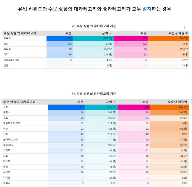 유입 키워드와 주문 상품의 카테고리가 모두 일치하는 경우에 한하여, 주문수와 주문 금액, 주문수량, 주문당 매출액을 확인해보았습니다.