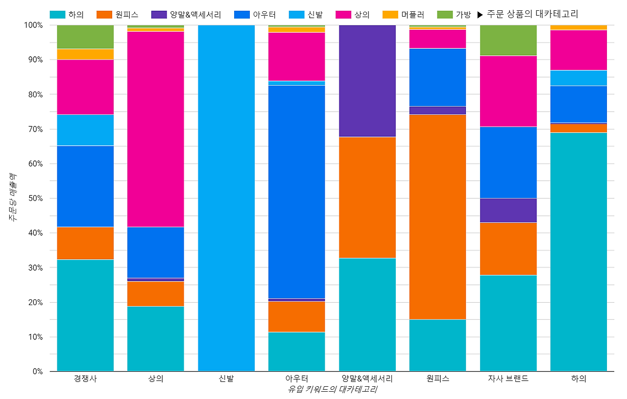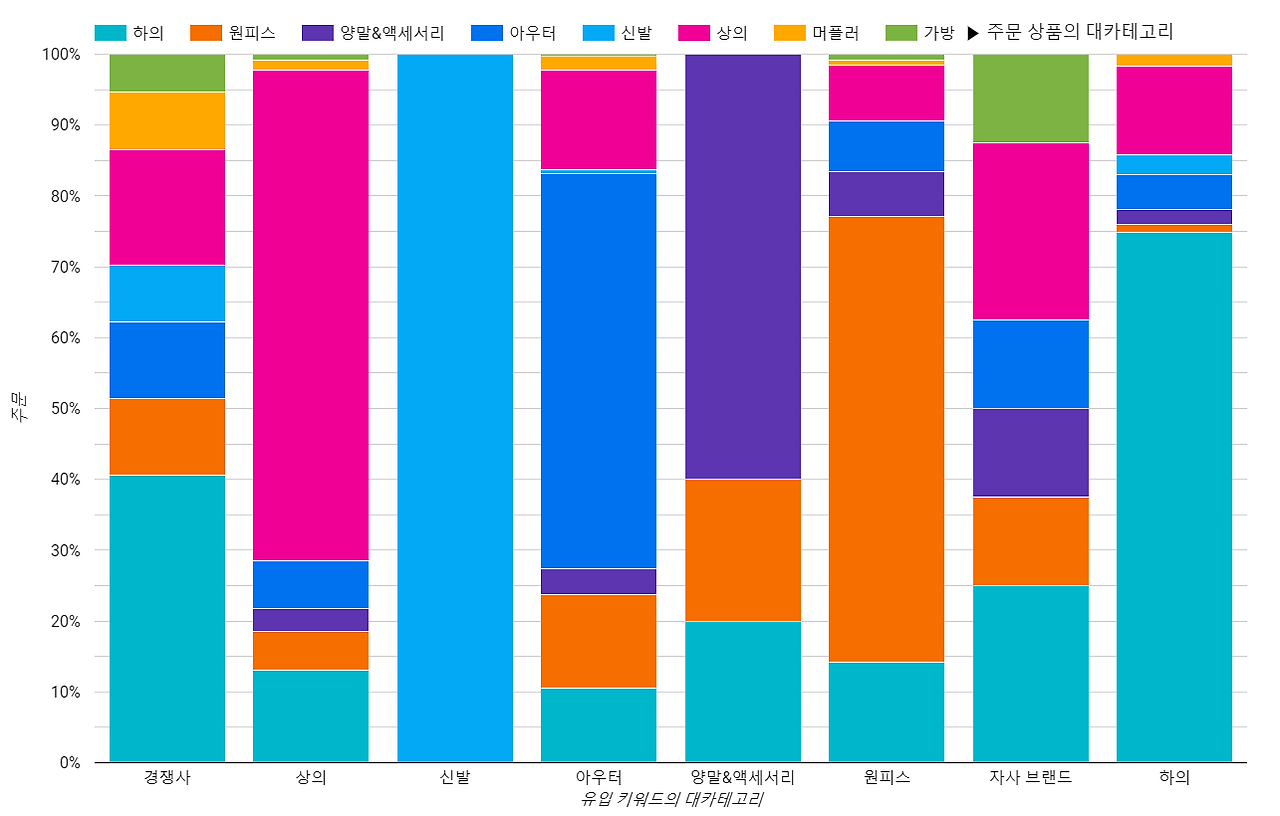 대카테고리가 ‘신발’로 분류되는 유입 키워드의 주문 상품은 모두 ‘신발’ 카테고리에 속합니다. ‘신발’ 유입 키워드는 유입수가 5건 미만이기에 100%라 해도 용인할 수 있었습니다. 그래프를 보면, ‘상의’, ‘아우터’, ‘양말&액세서리’, ‘원피스’, ‘하의’의 경우 유입 키워드의 대카테고리와 주문 상품의 대카테고리가 일치합니다.