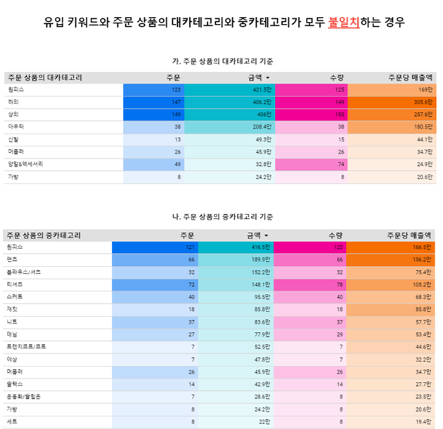 유입 키워드와 주문 상품의 카테고리가 모두 일치하지 않는 경우에 한하여, 주문수와 주문 금액, 주문수량, 주문당 매출액을 확인해보았습니다.