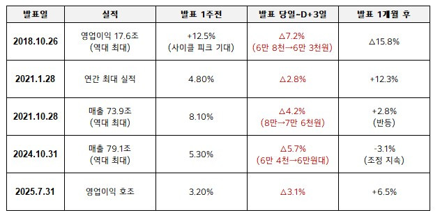 ▶ 발표 당일~D+3일: -3~7% 평균 하락 (차익실현 + 실적 기반영)