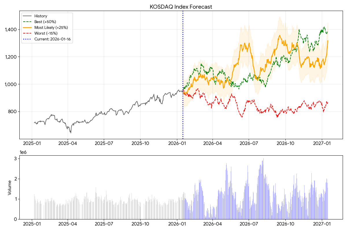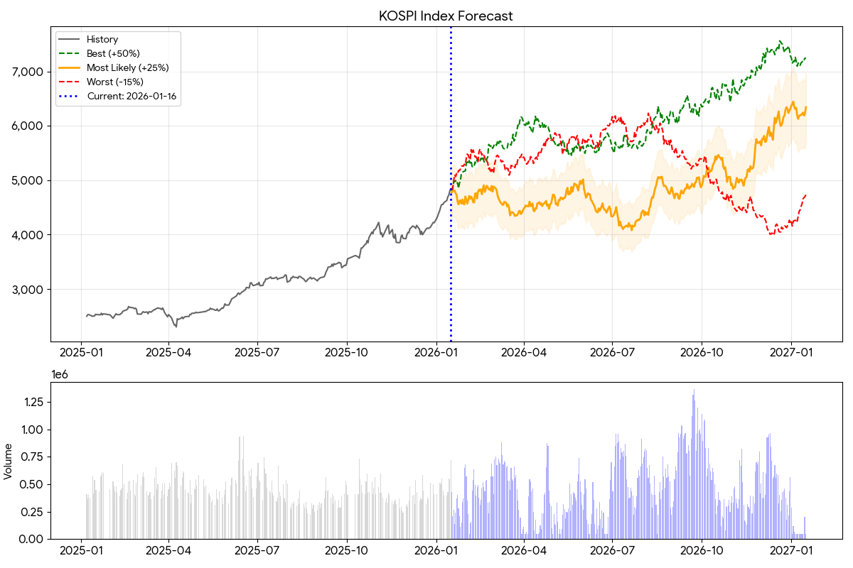 아래는 2026년 1월 16일 기준 과거 데이터를 기반으로 향후 1년 동안의 코스피와 코스닥 지수를 예측해 본 추정치이다. 본 예측모델에 대한 설명은 앞서 포스팅한 글을 참조하고, 그 결과는 아래와 같다.