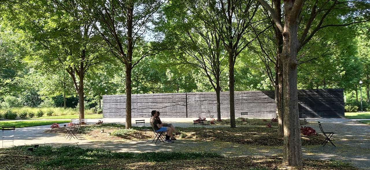 산책하기 앞서 친구 집 호수를 기억하고 사진을 찍은 덕택에 길을 헤매지 않고 돌아왔다. 집에 들어와서 보니 친구가 준비를 다 하고 당장이라도 나갈 듯한 자세를 취했다. 어디 가냐고 물어보니 노스캐롤라이나 주 미술관 (North Carolina Museum of Art)에 가자고 했다. 차를 타고 도착해보니 나무들과 사이사이에 있는 야외 건축물이 먼저 우리를 맞이했다. 미술관이 규모가 크다고 미리 친구한테서 들었지만 야외 공간이 이렇게 클 줄은 몰랐다. 초록의 느낌을 간직한 야외 공간에 흐뭇해하며 길을 따라 걸어가니 커다란 유리 건물이 우리를 맞이했다. 유리 건물이 나한테 얼른 들어오라고 손짓을 하고 나는 그 손짓을 따라 문을 힘껏 열고 들어간다.