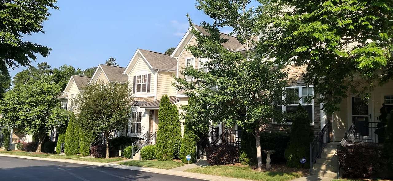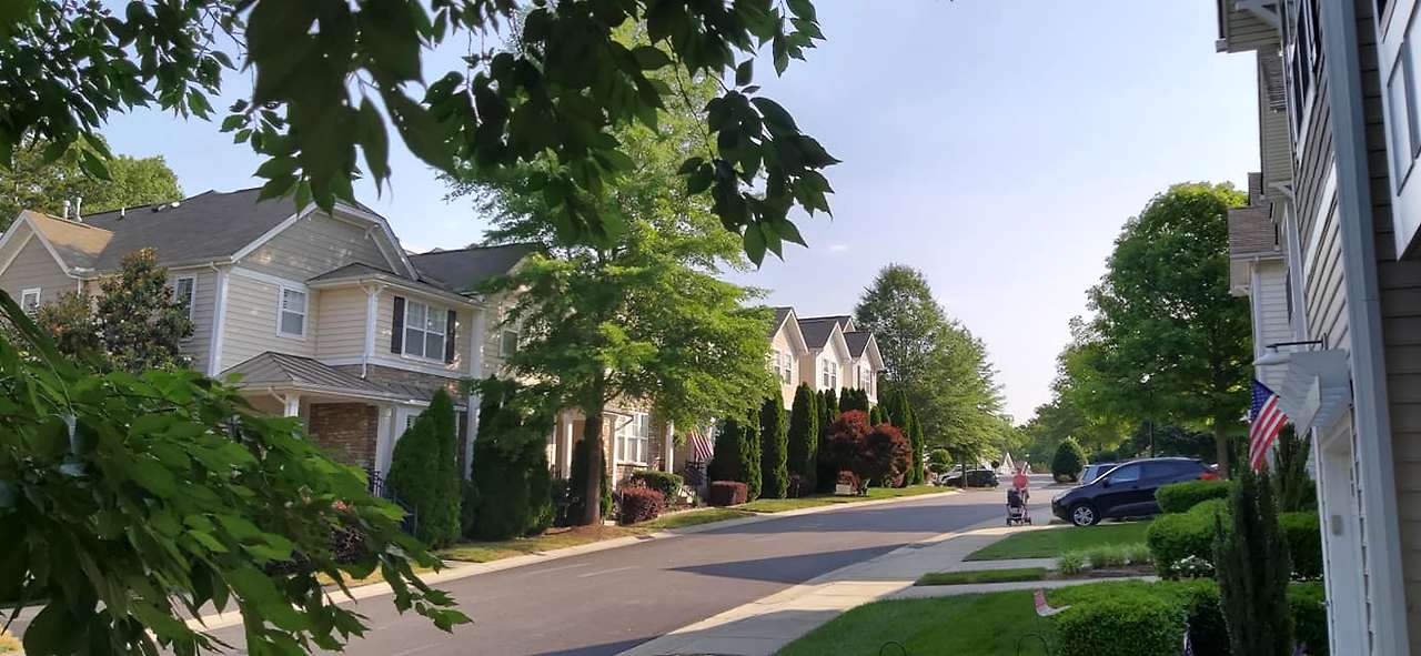 롤리의 주택가 풍경. 2층짜리 집이 도로를 따라 쭉 이어져있고 나무와 잔디가 조경을 이룬다. 성조기도 드문드문 보인다.