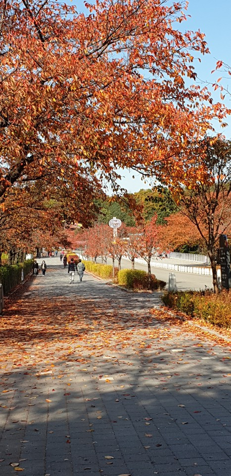 테마파크에서 나오자 단풍 둘레길이 있다는 표지판을 보고 곧장 거기로 달렸다. 차도를 사이에 두고 양 옆과 가운데에 단풍나무가 일렬로 정렬해 있었다. 울긋불긋한 단풍의 색깔과 청계산의 조화에 눈이 한껏 즐거워졌다. 그러다가 왜 특정 구역의 단풍이 더 잘 드는지 문득 궁금해서 단풍을 가까이서 보기로 했다. 지대가 특별히 높은 곳도 아닌데 말이다. 근데 나무에 가까이 접근해 보니 멀리서 볼 때랑 사뭇 달랐다. 성한 단풍잎도 있었지만 상처투성이인 단풍잎도 있었다. 어떤 단풍잎은 케첩과 같은 진한 빨간색이었고 어떤 단풍잎은 노을과 같은 그윽한 빨간색을 띠며 저마다의 붉은색으로 시간을 간직하고 있었다. 단풍잎을 보면서 장석주 시인 대표작 <대추 한 알>의 "저게 저절로 붉어질 리는 없다. 저 안에 태풍 몇개, 천둥 몇개, 벼락 몇개"라는 구절이 떠올랐는데 붉어짊을 위해 몇 개의 태풍과 천둥과 벼락을 견뎠을지 잠깐 상상을 해봤다. 그리고 나무에 붙어있는 단풍잎과 떨어진 단풍잎을 번갈아 보면서 괜한 사색에 잠겼다. 자연에 머무르면 왠지 그렇다. 여행하면서 아름다운 장면에 도취되다가 어떤 생각에 잠기면서 동적인 행위와 정적인 행위가 반복적으로 이뤄진다.