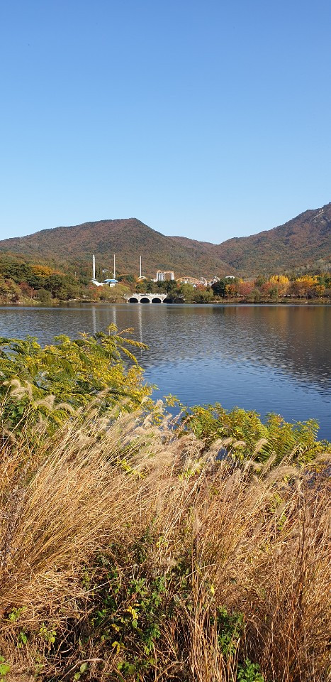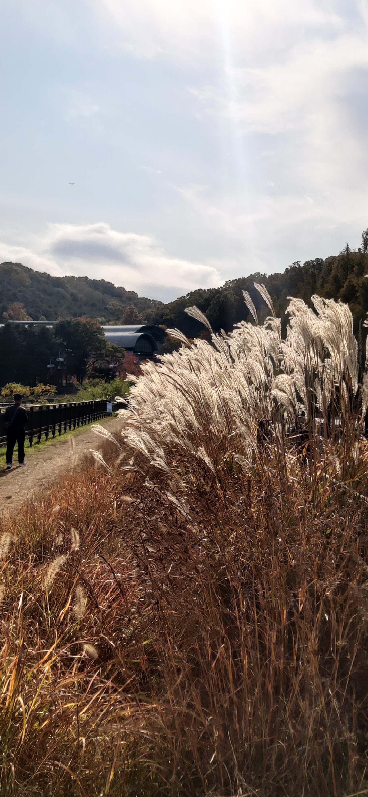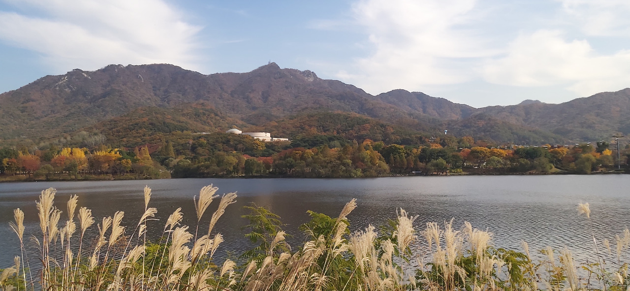 단풍 둘레길을 돌다가 테마파크 반대편에도 호숫가 둘레길이 조성되어 있음을 알았는데 표지판을 보고 헛웃음이 나왔다. 그냥 호숫가 둘레길이 아니라 "전망이 좋은" 호숫가 둘레길이란다. '전망이 좋다고 스스로 홍보를 하네. 정말로 전망이 좋은가?' 확인하고 싶은 욕구가 들어 단풍 둘레길 대로변에서 빠져나와 좁은 흙길로 향했다. 바로 호수가 보이겠지 생각했는데 처음에는 나무가 호수를 가로막고 있었다. 그러다 억새가 환영하면서 호수를 맘껏 보라고 손짓을 했다. 물가 앞에 갈색을 띤 억새 뒤편으로는 롤러코스터를 비롯해서 서울랜드가 보였다. 하얀 억새는 멀찍이 뒤에 있었는데 구름 사이로 햇빛이 관통하면서 억새에서 순간 빛이 났다. 찰나의 인상 깊은 장면을 마주한 즐거움을 가지고 더 걸어보기로 했다. 저 멀리 국립현대미술관 건물이 보이고 리프트가 대열을 이루면서 가고 있었다. 산자락의 장관과 더해져 또 다른 그림과 같은 풍경이 나왔다. 잠깐 쉬면서 다시 감상 모드로 들어갔다.