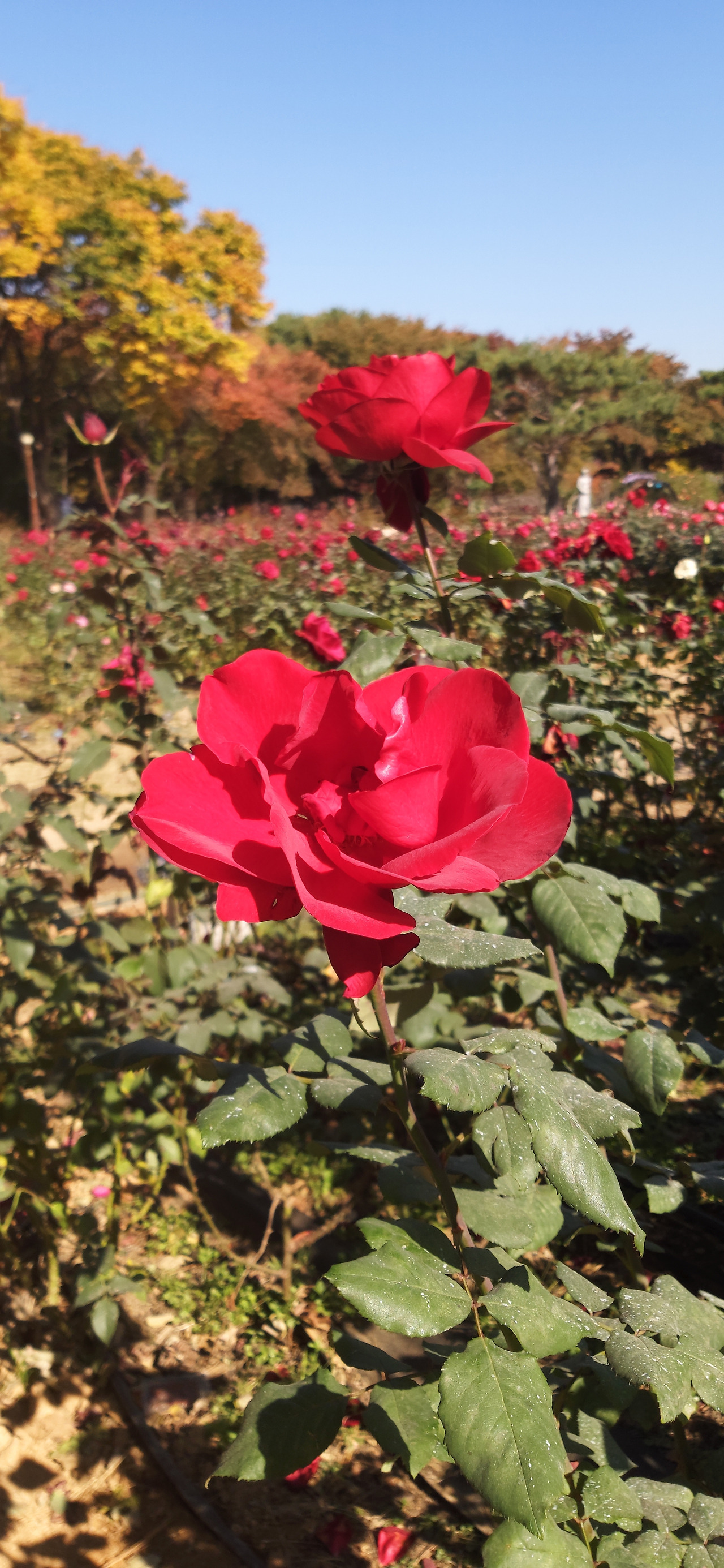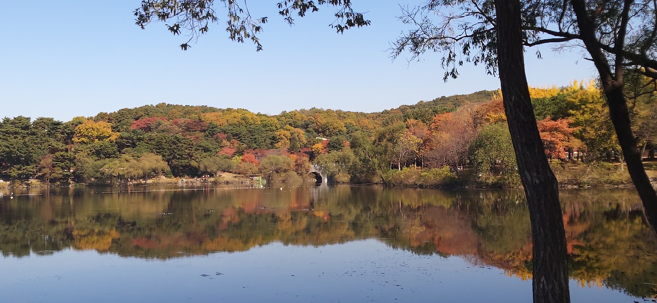 그런데 다리를 건너자 동물원과 서울랜드가 보이면서 마치 여기서 모이자고 미리 약속을 한 듯이 많은 사람들이 보였다. 다양한 곳으로 이동하는 인파 속에 홀로 남아있는 나는 어디를 갈까 고민하다가 마음 가는 대로 가보기로 하며 네이버 지도 어플에서 나왔다. 첫 번째로 들른 곳은 테마파크. 입구에 장미 정원이 있다고 해서 들어가 봤다. 향기를 맡으며 장미가 완전히 지기 전에 사진을 찍어댔다. 그런데 더 좋은 것은 따로 있었다. 테마파크 안쪽 아랫길을 쭉 걸어가니 드넓은 호숫가와 단풍이 절경을 이루며 색깔 놀이를 하고 있었다.붉게 물든 완전체 낙엽, 주황색을 띤 과도기 낙엽, 푸른 녹색을 유지한 낙엽. 노란색의 은행나무도 드문드문 보였다. 땅 위와 물 위의 경치 둘 다 나름의 운치가 있었다. 햇빛이 드는 근처 벤치에 자리를 잡고 한동안 시선을 고정한 채로 한 폭의 그림과 같은 풍경을 감상했다. 물 위에는 오리와 거위가 푸드덕거리며 날아갔고 땅 위에는 까치와 참새가 지저귀며 화음 아닌 화음을 조성했다. 그러다 어린애들이 뛰어노는 소리가 들리면서 고요한 분위기를 깨뜨렸다. 벤치에서 일어나서 나머지 반 바퀴를 걷고는 공원에서 빠져나왔다.