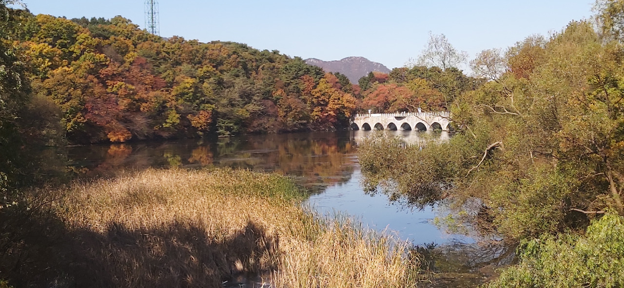 서울대공원에는 호숫가 둘레길과 산행길이 서로 연결돼 있어서 호숫가 둘레길에서 위로 올라가도 되고 산행길에서 아래로 내려가도 된다. 산행길은 어떨까 싶어 삼삼오오 모이신 어르신을 따라갔다가 지쳐서 호숫가 둘레길로 내려가니 작은 다리와 함께 단풍이 보였다. 수풀이랑 나무가 우거져 아무도 없을 듯한 분위기를 자아냈다. 아무도 밟지 않는 길을 지나가는 듯한 느낌. 이 공간에 나만 있다는 생각에 묘한 기분을 느끼고는 다리가 있는 곳으로 걸어갔다.