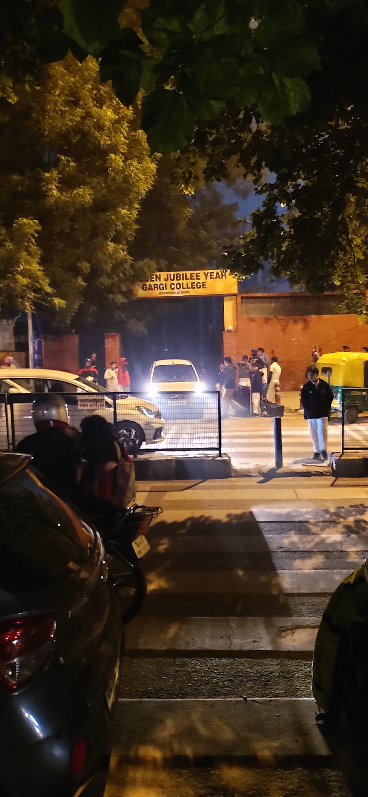 델리의 대학가 근처 밤 풍경. 오토바이, 차, 릭샤가 도로에 같이 달리고 있다. 여기는 횡단보도가 있지만 없는 구간도 있다.