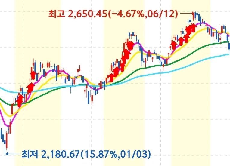 위 차트는 23년 코스피 차트이다. 추세를 분석하는 방법 중 이동평균선을 통해 추세를 분석해 매매했다. 위 노란색 박스 구간은 20일 이동평균선과 10일 이동평균선의 골든크로스 구간으로, 정배열 구간이다. 반대로 노란색 박스가 없는 구간은 역배열 구간이다. 이동평균선이 정배열인 노란색 박스 구간에서만 매매를 한 덕분에 손실 없이 매매를 할 수 있었다. 주가는 일관된 방향으로 가려는 성질이 있고, 주가가 정배열 상승 추세일 때는 추세를 이탈할 때까지 상승하기 때문이다. (이동평균선 만으로는 추세 분석이 완벽하지 않기 때문에 캔들, 거래량, 지지/저항 등의 분석이 더 필요하다.) 시장을 예측하려 하지 않고, 시장의 방향성에 따라 매매만 했을 뿐인데 수익은 월등히 높아졌다. 코로나19 창궐 이후 급격히 하락한 주식 시장이 1월부터 지금까지 지속적인 우상향 추세를 보였다. 이 시장을 예측하는 것은 불가능했다. 삼성전자는 역대 최악의 적자를 기록했고, 물가는 체감될 정도로 상승했다. 기업은 고용을 줄이고, 청년 채용률도 급감했다. 이런 악재가 체감되는 시장이 7개월 동안 쉬지 않고 상승했다. 투자자는 시장을 의심해서는 안된다. 아무리 하락할 것 같은 시장이라도 시장이 오르면 적극적으로 매매하고, 시장이 하락하기 시작하면 매매를 멈춰야 한다. 물론, 추세를 따르는 매매만이 정답은 아니다. 투자자마다 성향이 다르고, 맞는 전략 또한 다를 것이다. 하지만 몇 년 간의 주식 투자를 겪으면서 수 백가지 전략을 사용해 봤지만 추세 추종 매매는 효과적인 전략이자, 시장 움직임에 대한 대응이 가능한 전략이었다. 개인 투자자라면 시장을 예측하지 말고 대응하자. 시장이 상승할 때만 투자를 하고, 시장이 하락할 때는 비중을 줄여보길 권한다. 이러한 전략이 결국 큰 수익으로 이어질 것이라 확신한다.