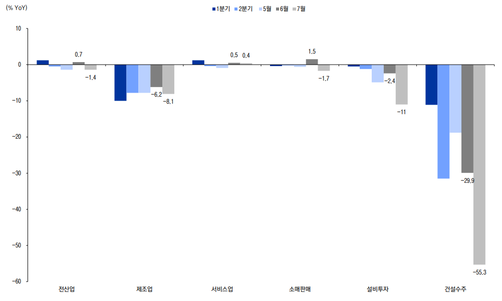 한국의 경제 상황을 분석해 보자면, 경기 선행지표인 건설수주액을 확인하면 -55.3을 기록 중이며,