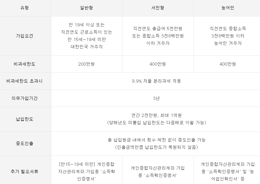ISA(Individual Saving Account) 계좌는 절세를 통해 재산 형성을 돕기 위해 2016년에 만들어진 상품입니다. 하나의 계좌에서 주식, ETF, 펀드, ELS, RP 등 다양한 상품을 투자할 수 있으며, 연 400만 원(서민형 기준) 수익에 대한 절세가 가능합니다. '3년 의무가입 기간', '해외주식 직접 투자 불가'라는 단점이 있기 때문에, ETF를 통한 장기투자 전략에 적합한 계좌입니다. 가입 요건 및 비과세 한도 등은 밑에 표를 참고해 주시길 바랍니다.