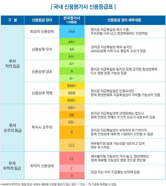 신용등급은 위 표와 같이 이루어지며, 투자 요주의 등급부터는 리스크가 크기 때문에 투자 적격 등급 내에서만 투자할 것을 권합니다.