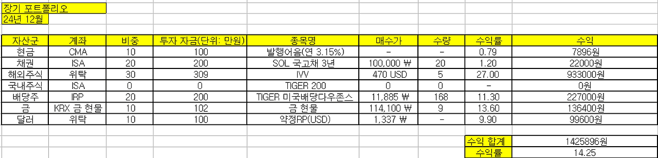 당분간은 해당 포트폴리오를 업그레이딩, 리벨런싱 없이 유지할 계획입니다. 미국 주식에 수급이 집중되고, 달러 및 금의 수요 또한 강하기 때문입니다. 25년 1분기 이후 3~4월쯤에 포트폴리오 점검을 통해 리벨런싱을 진행하도록 하겠습니다.